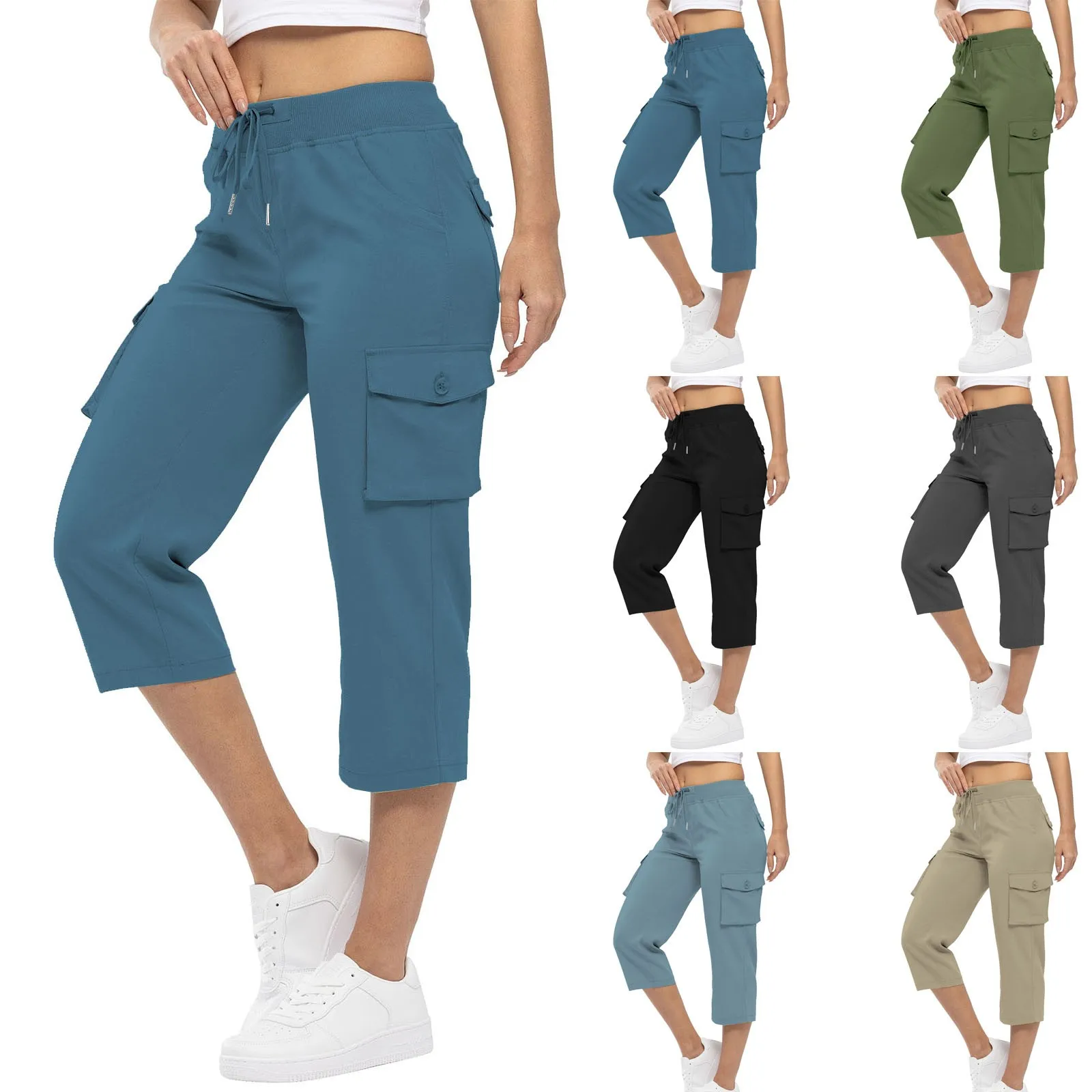 Women's Cargo Capris Relaxed Fit Drawstring Waist Cargo Pant Summer Casual Lightweight 3/4 Trousers Pockets